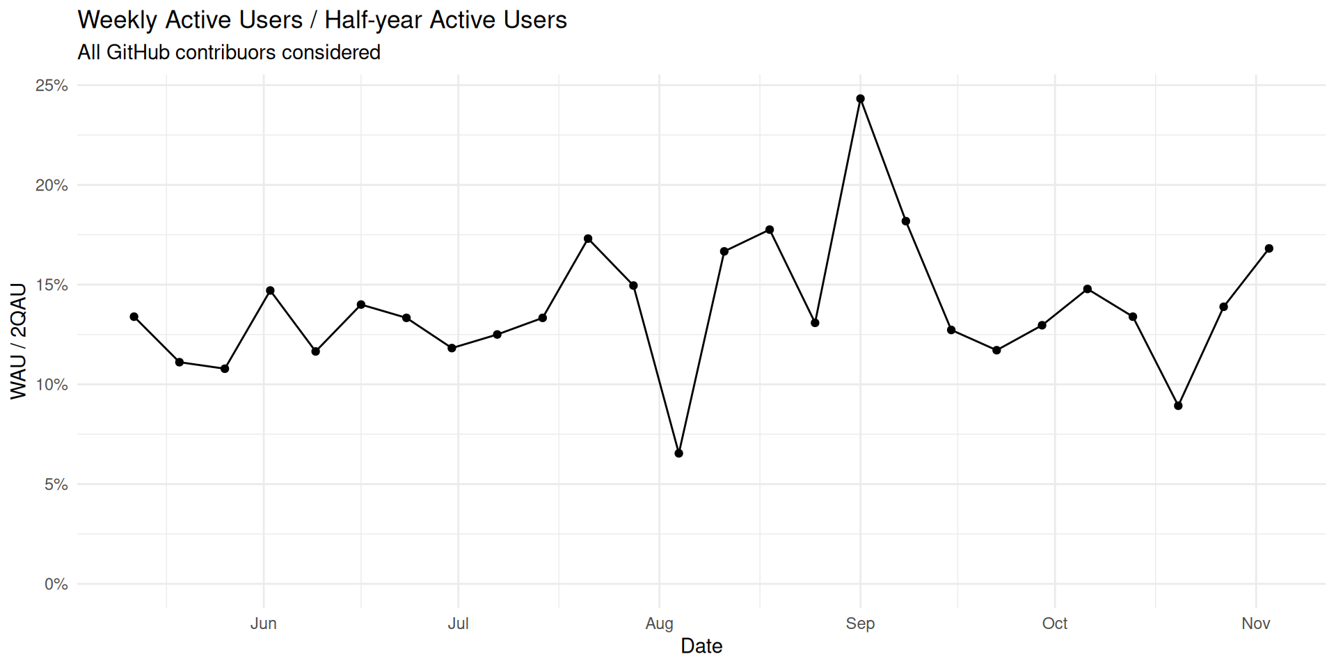 This plot uses the concept of “Weekly Active Users” and “Half-Year Active Users” to express a ratio (WAU / 2QAU). The higher this ratio, the better we are doing at retaining people: