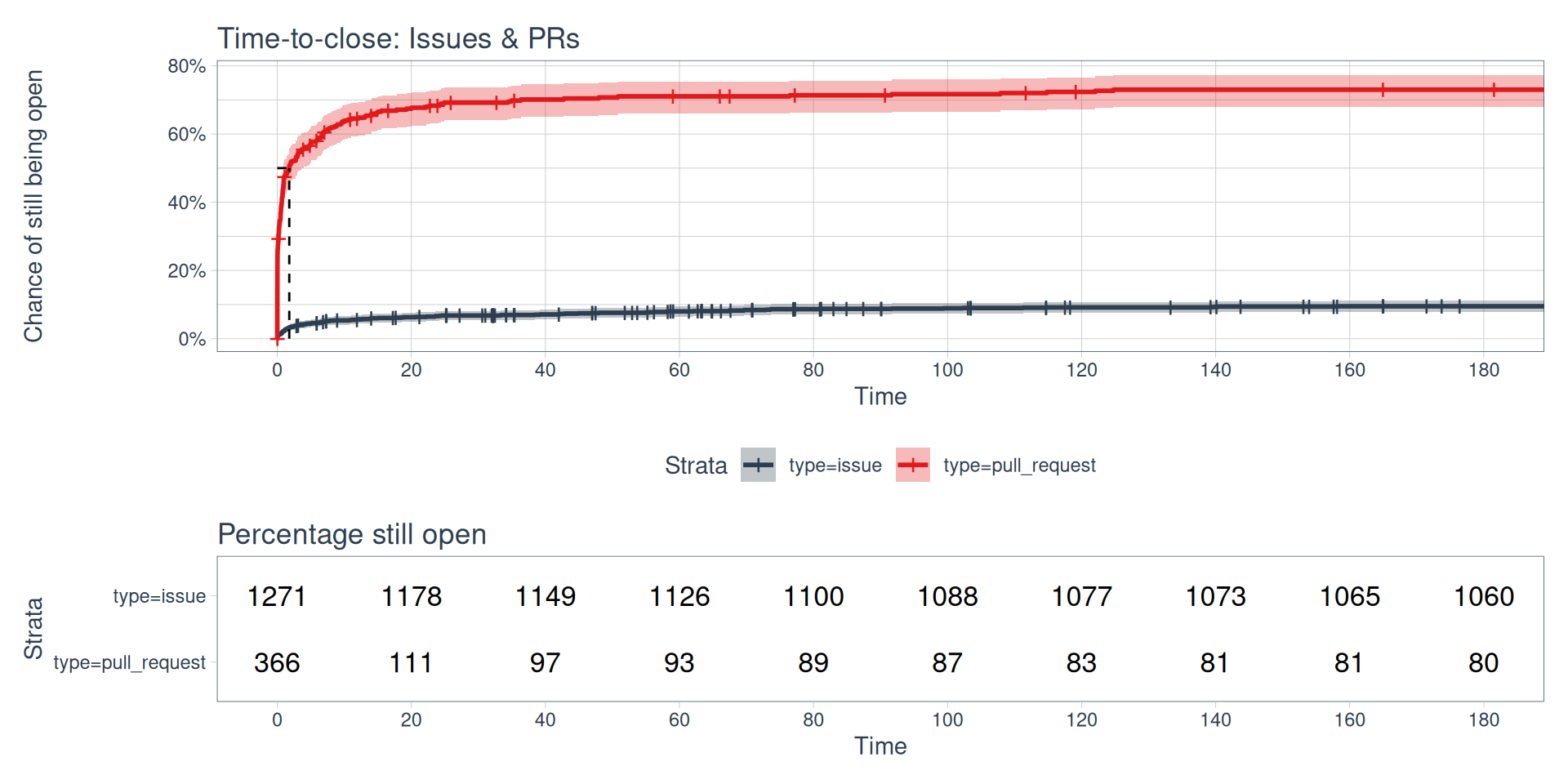 The Survival curves count any Issue/PR closed in the last 6 months, or still open at the time of calculation
