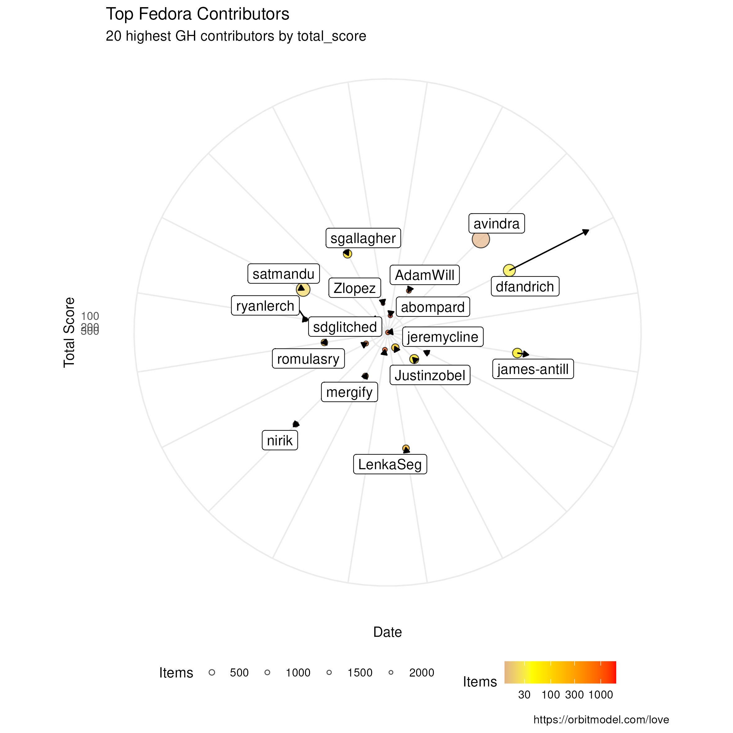 This plot uses the Orbit-Love model to count activity, and includes any person who has a minimum threshold of activity. See the Processing Notes appendix for details on the calculations.
